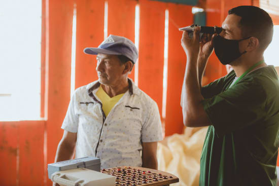 (In the photo, workers at Manos Juntas are conducting a Brix test to measure the sugar content of the coffee. The device is a refractometer.)